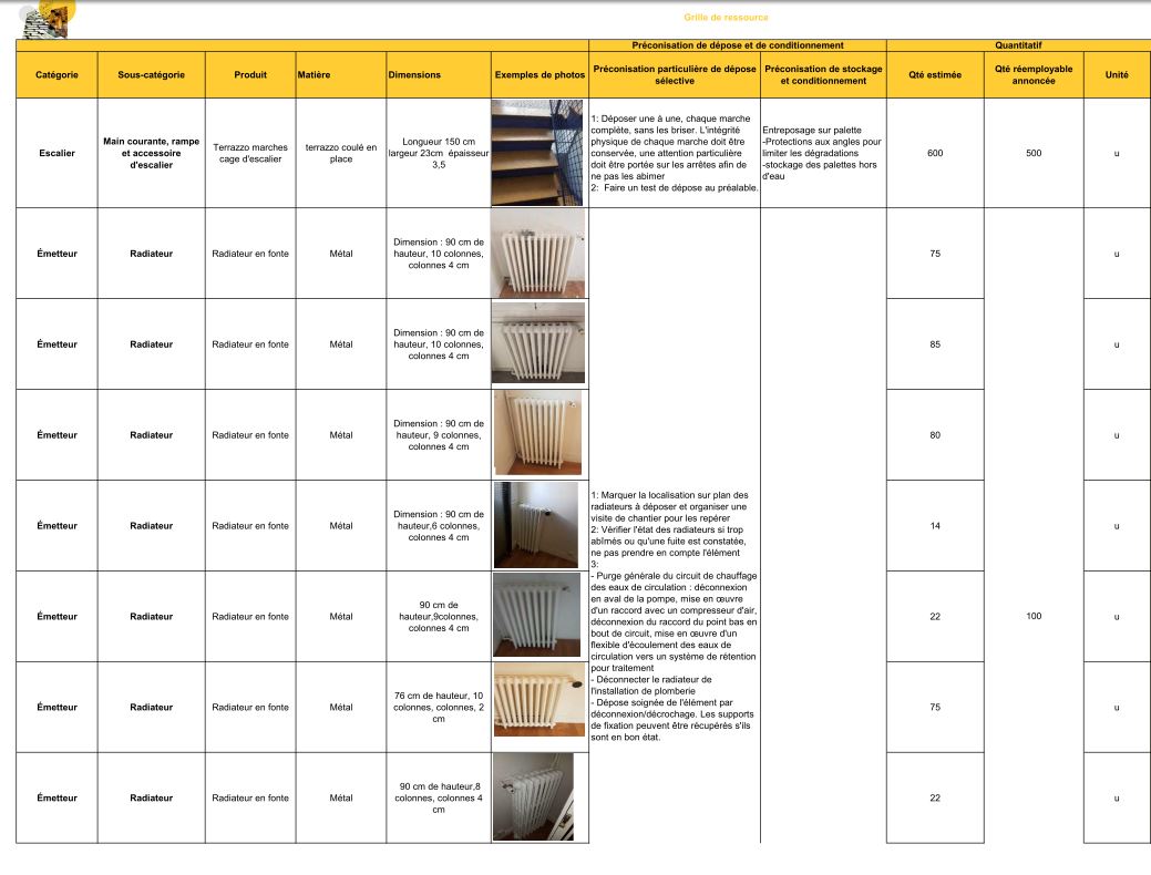 Au fur et à mesure des expériences, Cycle Up a mis au point des outils digitaux pour les professionnels afin de rendre la pratique du diagnostic plus accessible et systématique, notamment avec l’application DIAG-IT[2]qui permet de générer l’inventaire d’un site ainsi qu’un module BIM pour visualiser les différents matériaux sur un projet. Chacun des matériaux dispose ensuite d’une fiche produit pouvant servir à la vente ou aux dons.