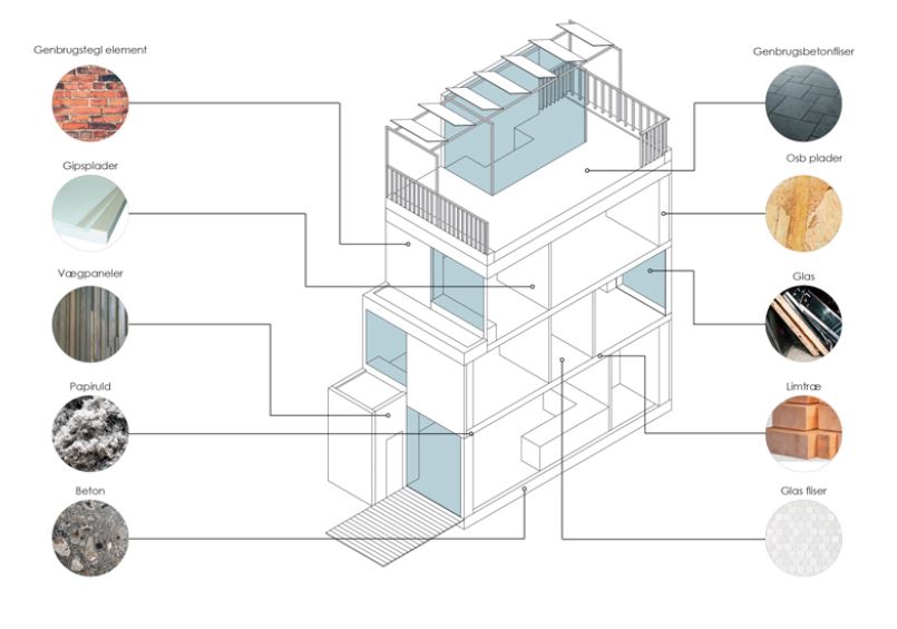 D’autres matériaux ont été intégrés au projet tel que les sols intérieurs et du bois de réemploi pour les terrasses extérieures [2] le platelage des toitures et certaines fenêtres des maisons. Le bois réemployé provient des caisses de bois ayant servi de transports pour des modules de béton pour le métro de Copenhague.