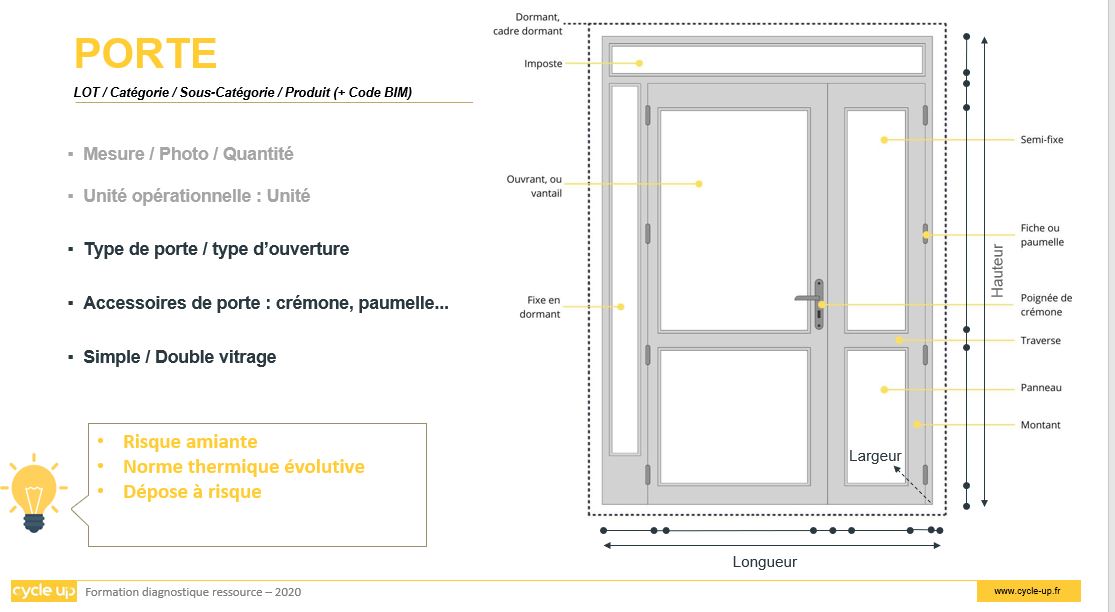 Figure 4 : Extrait d’une grille de diagnostic-ressource avec l’exemple d’une caractérisation d’une porte lors d’un diagnostic, établi par Cycle Up. © CycleUp
